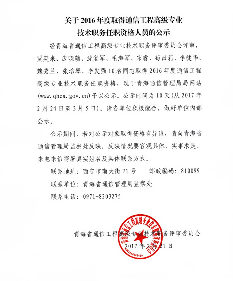 关于2016年度取得通信工程高级专业技术职务任职资格人员的公示